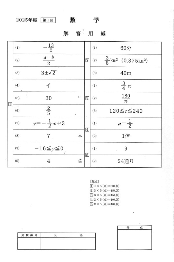 2025年度入試過去問題 (数学 解答)(1ページ目)|帝京高等学校の入試過去問