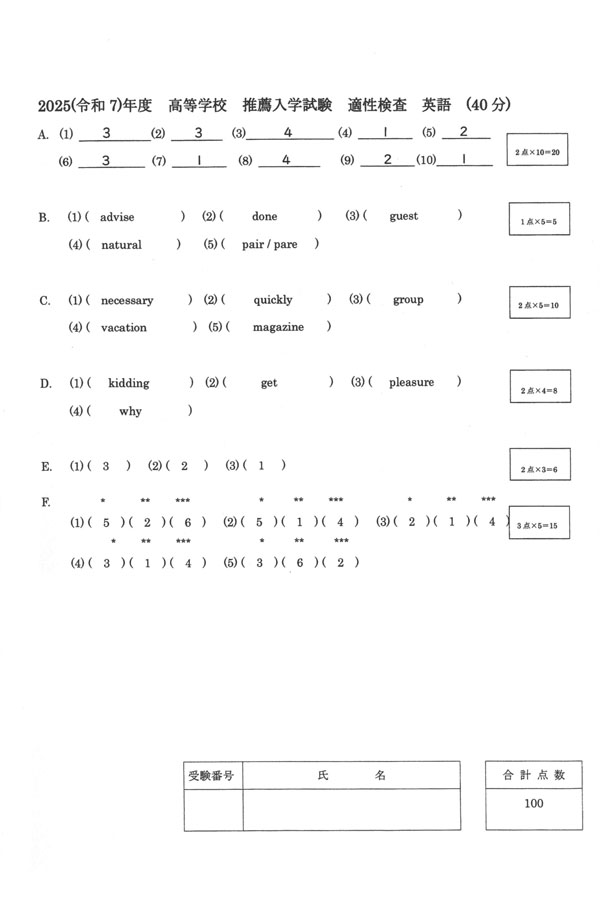 2025年度入試過去問題 推薦(英語 解答)(1ページ目)|法政大学高等学校の入試過去問