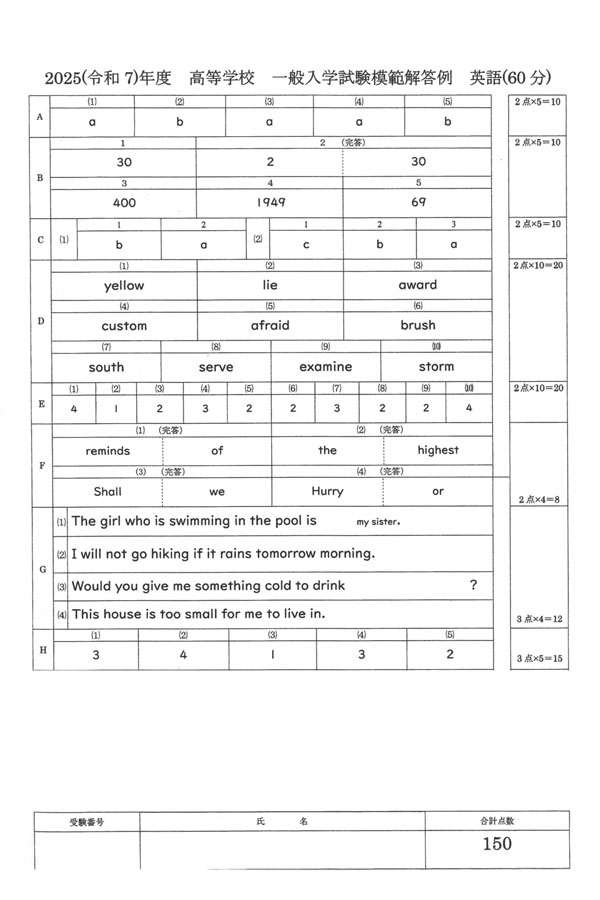 2025年度入試過去問題 一般 (英語 解答)(1ページ目)|法政大学高等学校の入試過去問
