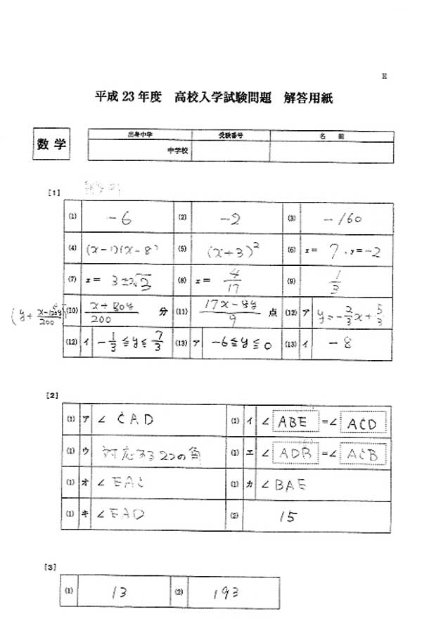 平成23年度入試過去問題(数学 解答)(1ページ目)|鶴見大学附属高等学校の入試過去問