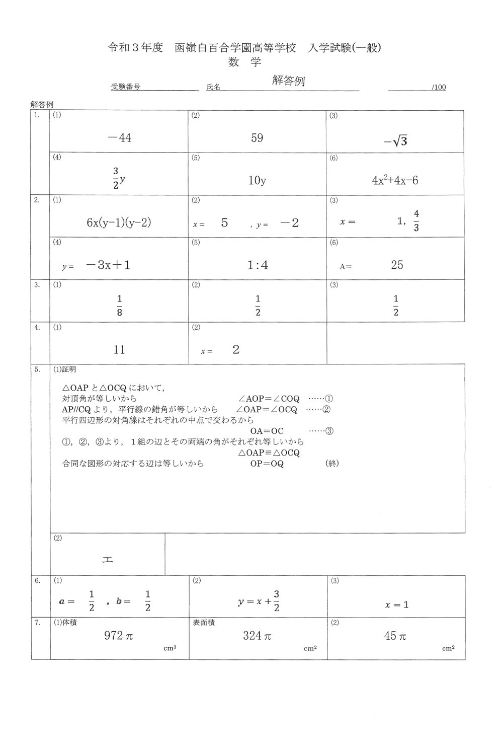 令和3年度入試過去問題(数学 解答)(1ページ目)|函嶺白百合学園高等学校の入試過去問
