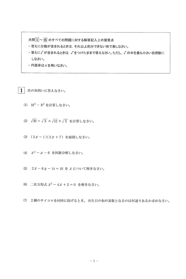 令和7年度入試過去問題(数学 問題)(1ページ目)|九州国際大学付属高等学校の入試過去問