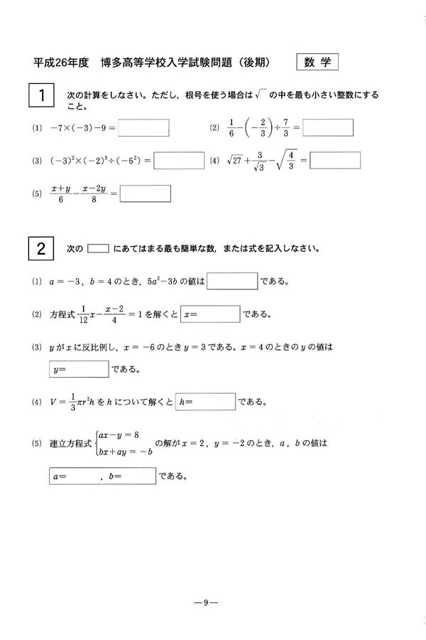 平成26年度入試過去問題 後期(数学 問題)(1ページ目)|博多高等学校の入試過去問