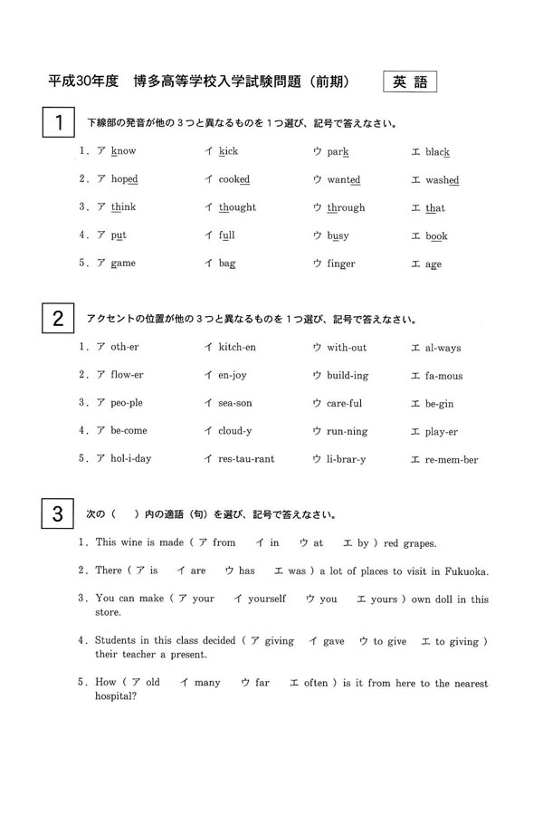 平成30年度入試過去問題 前期(英語 問題)(1ページ目)|博多高等学校の入試過去問