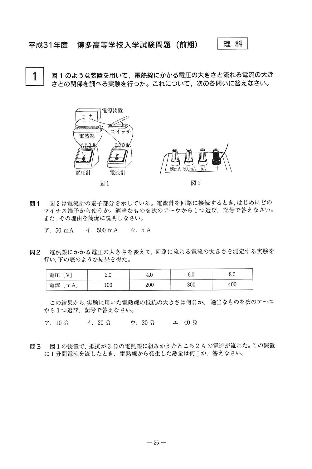 平成31年度入試過去問題 前期(理科 問題)(1ページ目)|博多高等学校の入試過去問