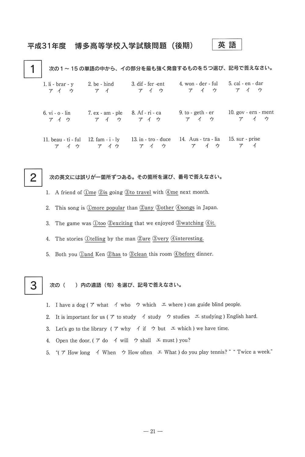 平成31年度入試過去問題 後期(英語 問題)(1ページ目)|博多高等学校の入試過去問