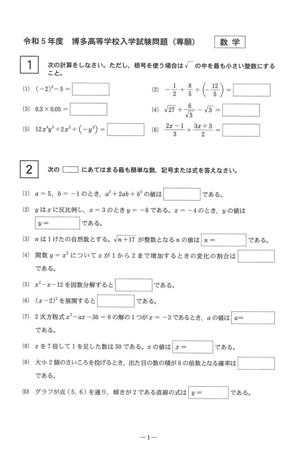 入試過去問(問題)(1ページ目)|博多高等学校の入試過去問