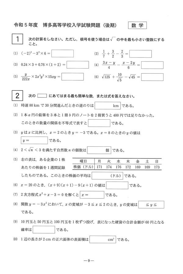 令和5年度入試過去問題 後期(数学 問題)(1ページ目)|博多高等学校の入試過去問