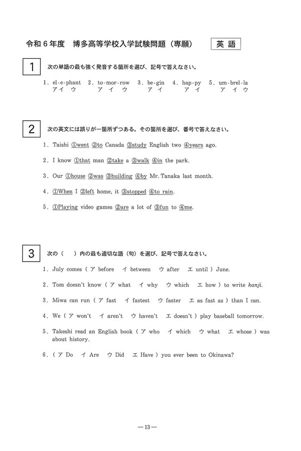 令和6年度入試過去問題 専願(英語 問題)(1ページ目)|博多高等学校の入試過去問
