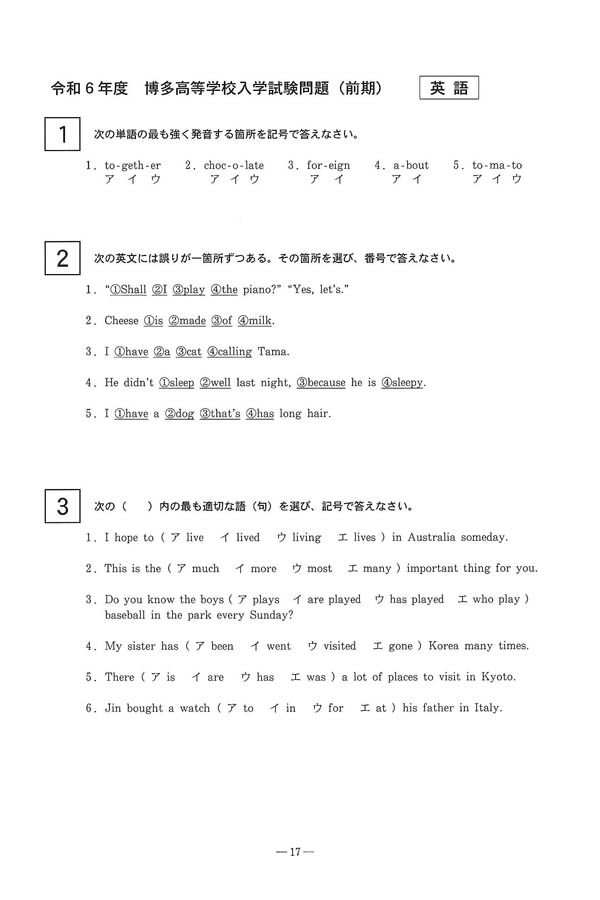 令和6年度入試過去問題 前期(英語 問題)(1ページ目)|博多高等学校の入試過去問