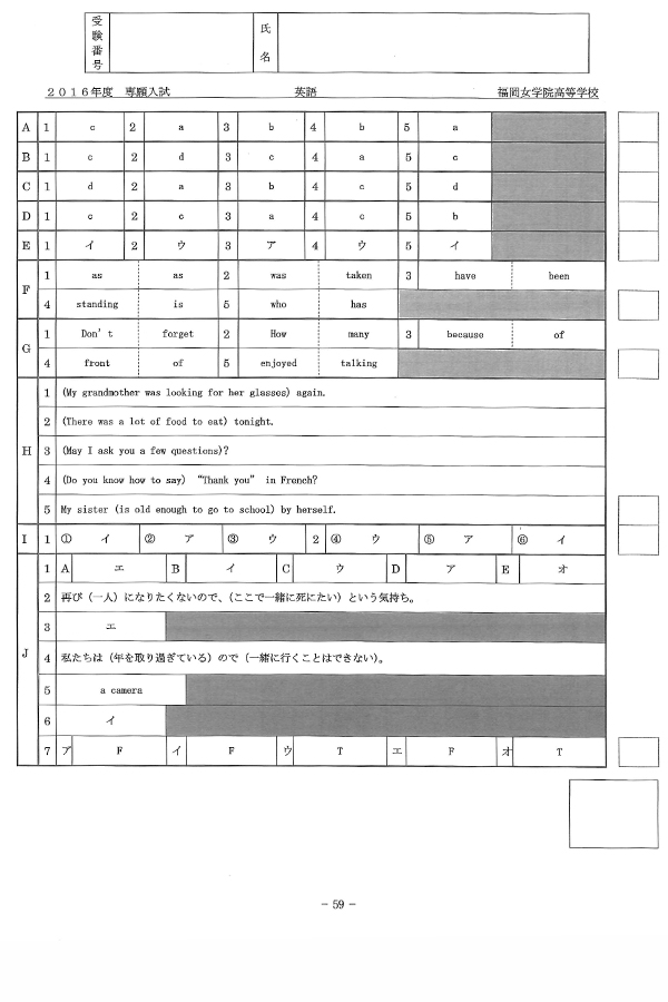 平成28年度入試過去問題 普通科 専願(英語 解答)(1ページ目)|福岡女学院高等学校の入試過去問