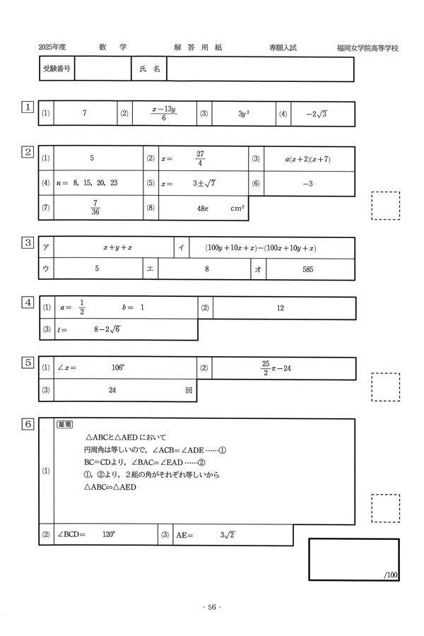 2025年度入試過去問題(専願)(数学 解答)(1ページ目)|福岡女学院高等学校の入試過去問