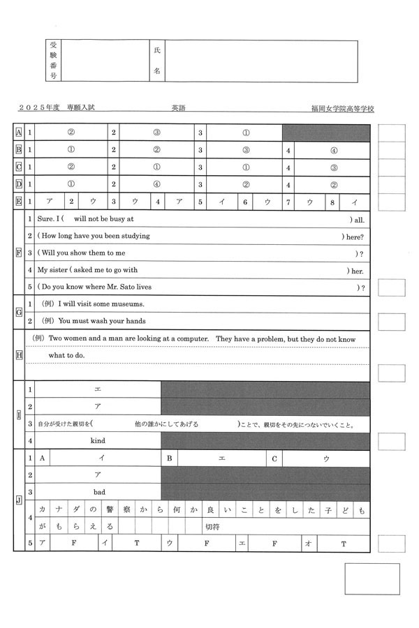 2025年度入試過去問題(専願)(英語 解答)(1ページ目)|福岡女学院高等学校の入試過去問