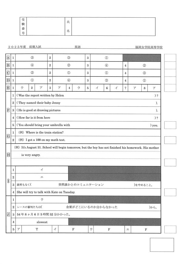 2025年度入試過去問題(前期)(英語 解答)(1ページ目)|福岡女学院高等学校の入試過去問