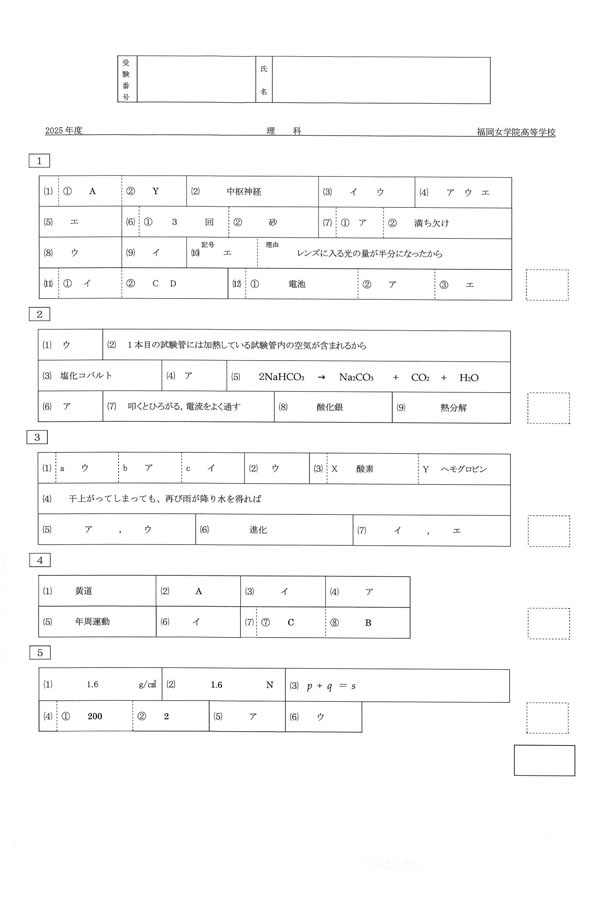 2025年度入試過去問題(前期)(理科 解答)(1ページ目)|福岡女学院高等学校の入試過去問