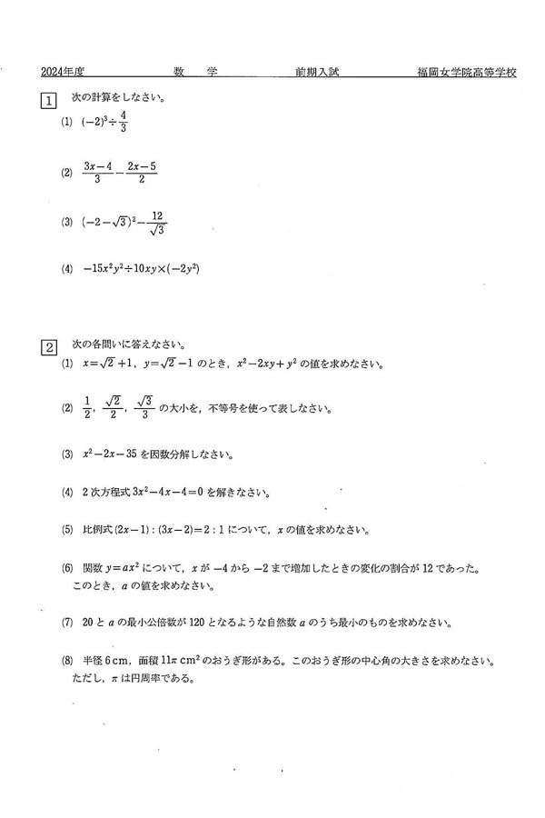 2024年度入試過去問題 前期(数学 問題)(1ページ目)|福岡女学院高等学校の入試過去問