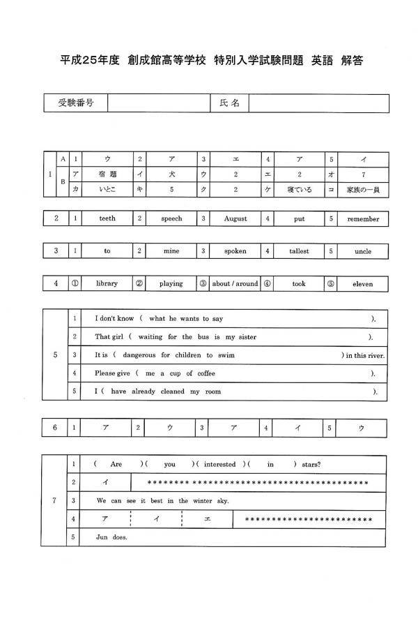 平成25年度入試過去問題(英語 解答)(1ページ目)|創成館高等学校の入試過去問