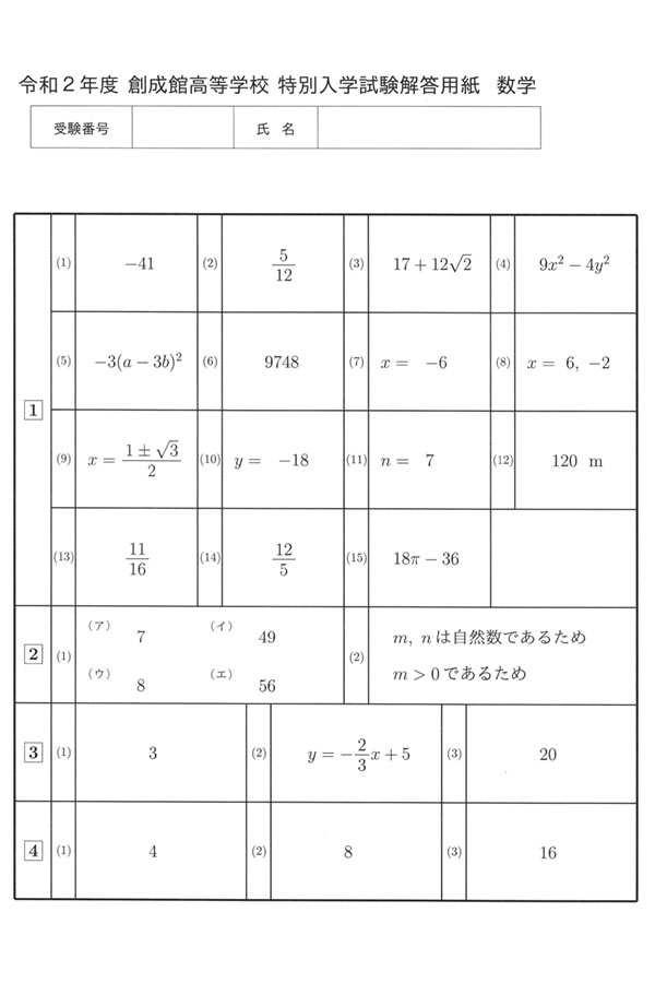 令和2年度入試過去問題 特別入学試験(数学 解答)(1ページ目)|創成館高等学校の入試過去問
