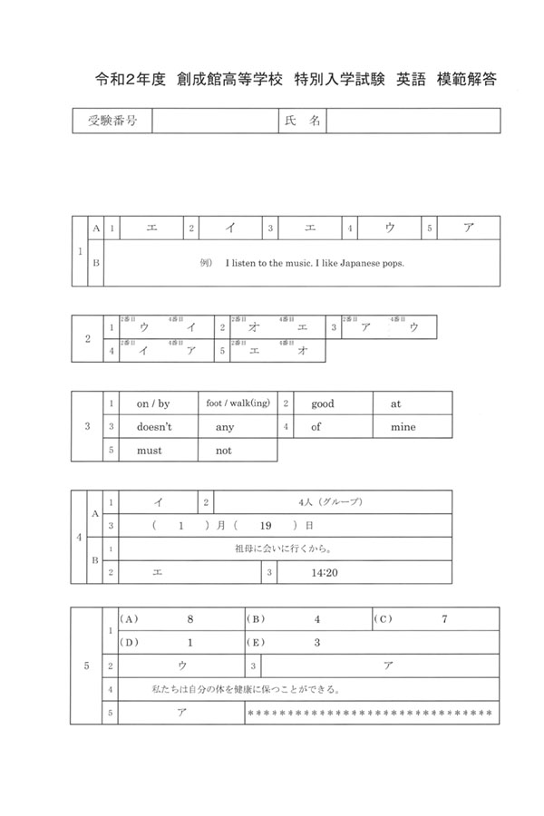 令和2年度入試過去問題 特別入学試験(英語 解答)(1ページ目)|創成館高等学校の入試過去問