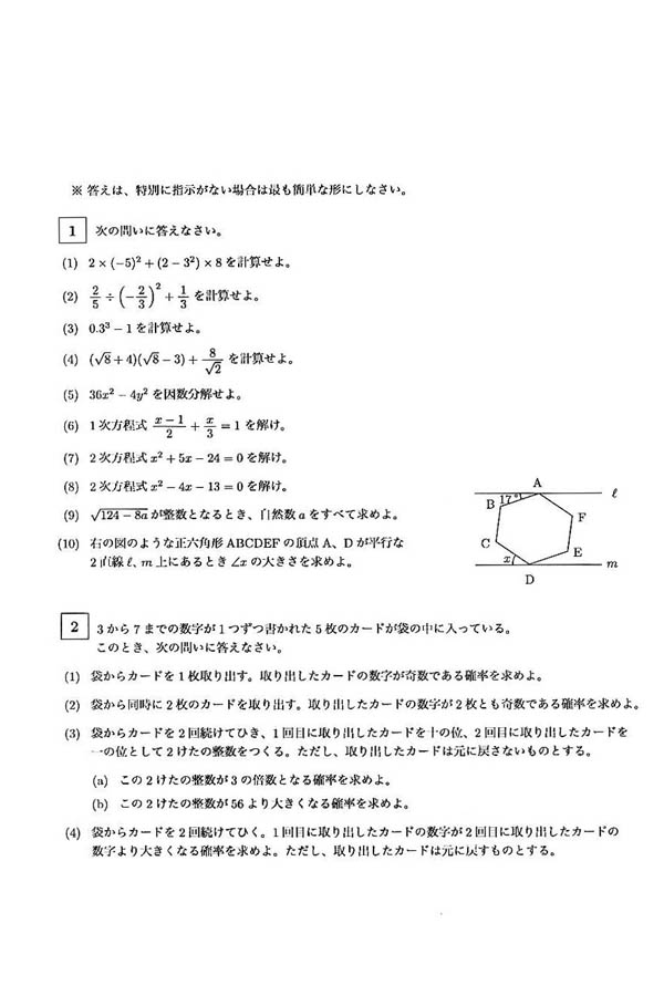 平成25年度入試過去問題(数学 問題)(1ページ目)|創成館高等学校の入試過去問