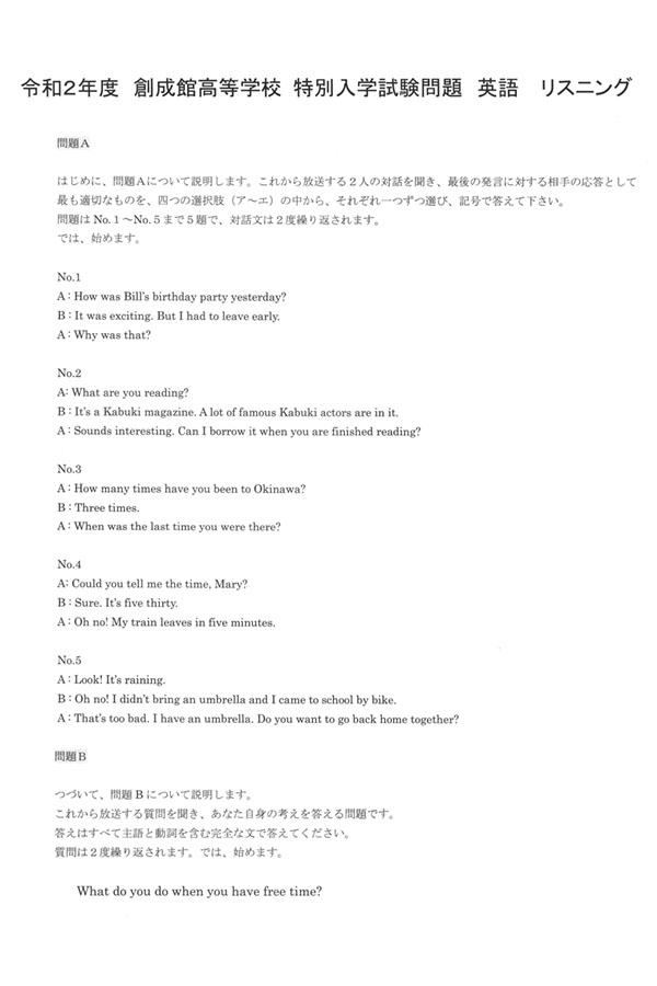 令和2年度入試過去問題 特別入学試験(英語 問題)(1ページ目)|創成館高等学校の入試過去問
