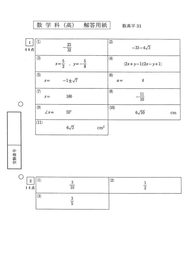 平成31年度入試過去問題(数学 解答)(1ページ目)|青雲高等学校の入試過去問