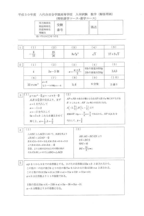 平成30年度入試過去問題 特別進学コース・進学コース(数学 解答)(1ページ目)|八代白百合学園高等学校の入試過去問