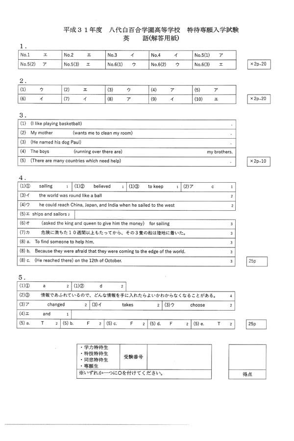 平成31年度入試過去問題(英語 解答)(1ページ目)|八代白百合学園高等学校の入試過去問