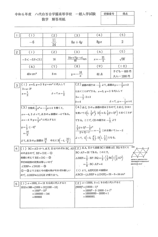 令和6年度入試過去問題 一般(数学 解答)(1ページ目)|八代白百合学園高等学校の入試過去問