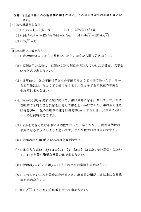 平成24年度入試過去問題(数学 問題)(1ページ目)|八代白百合学園高等学校の入試過去問