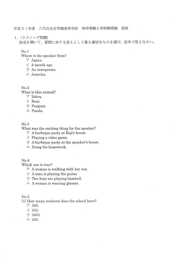 平成31年度入試過去問題(英語 問題)(1ページ目)|八代白百合学園高等学校の入試過去問