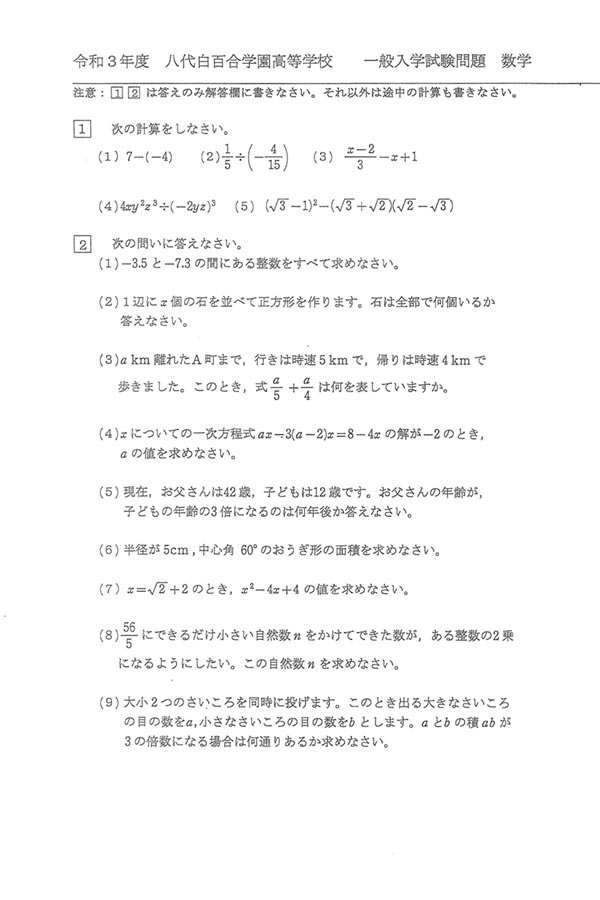 2021年度入試過去問題 一般入試(数学 問題)(1ページ目)|八代白百合学園高等学校の入試過去問