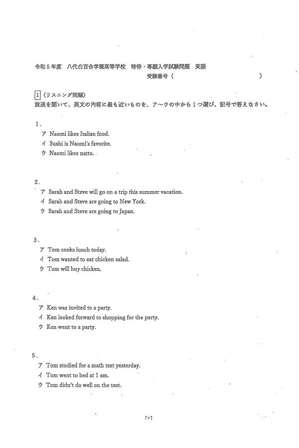 2023年度入試過去問題 特待・専願入試(英語 問題)(1ページ目)|八代白百合学園高等学校の入試過去問