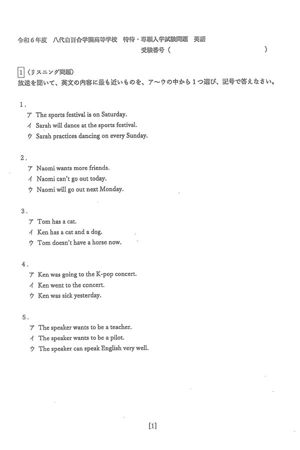 令和6年度入試過去問題 特待・専願(英語 問題)(1ページ目)|八代白百合学園高等学校の入試過去問