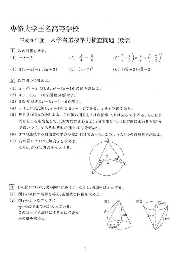 平成25年度入試過去問題(数学 問題)(1ページ目)|専修大学熊本玉名高等学校の入試過去問