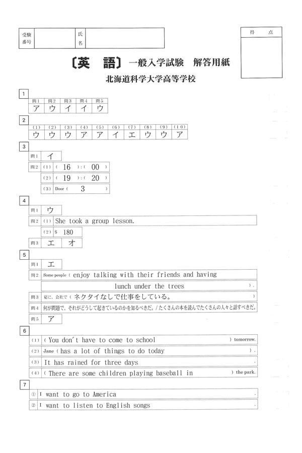 2020年度入試過去問題(英語 解答)(1ページ目)|北海道科学大学高等学校の入試過去問