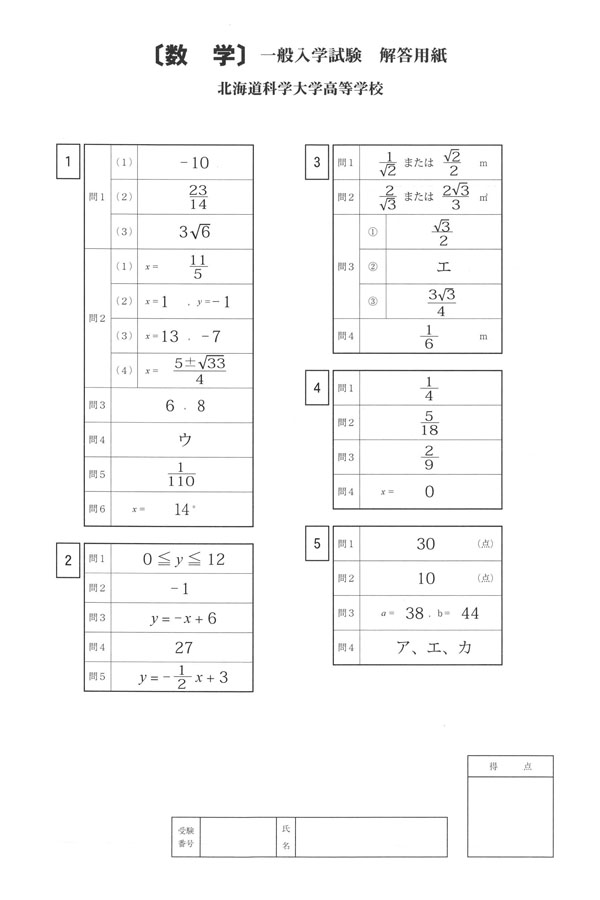 2025年度入試過去問題 (数学 解答)(1ページ目)|北海道科学大学高等学校の入試過去問