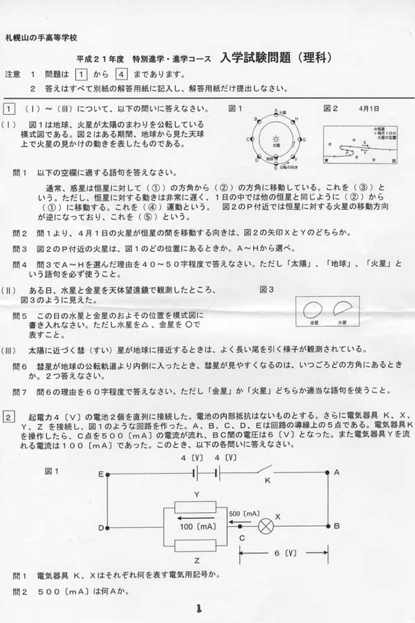 平成21年度入試過去問題 特別進学・進学コース(理科 問題)(1ページ目)|札幌山の手高等学校の入試過去問