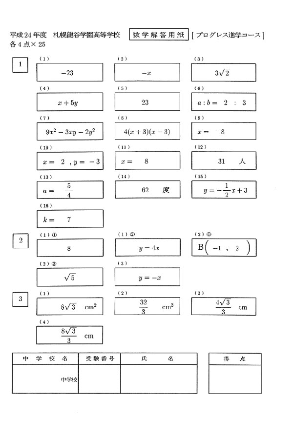 平成24年度入試過去問題 (プログレス進学コース)(数学 解答)(1ページ目)|札幌龍谷学園高等学校の入試過去問