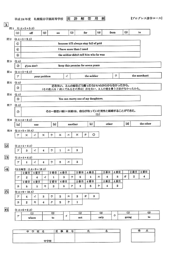 平成24年度入試過去問題 (プログレス進学コース)(英語 解答)(1ページ目)|札幌龍谷学園高等学校の入試過去問