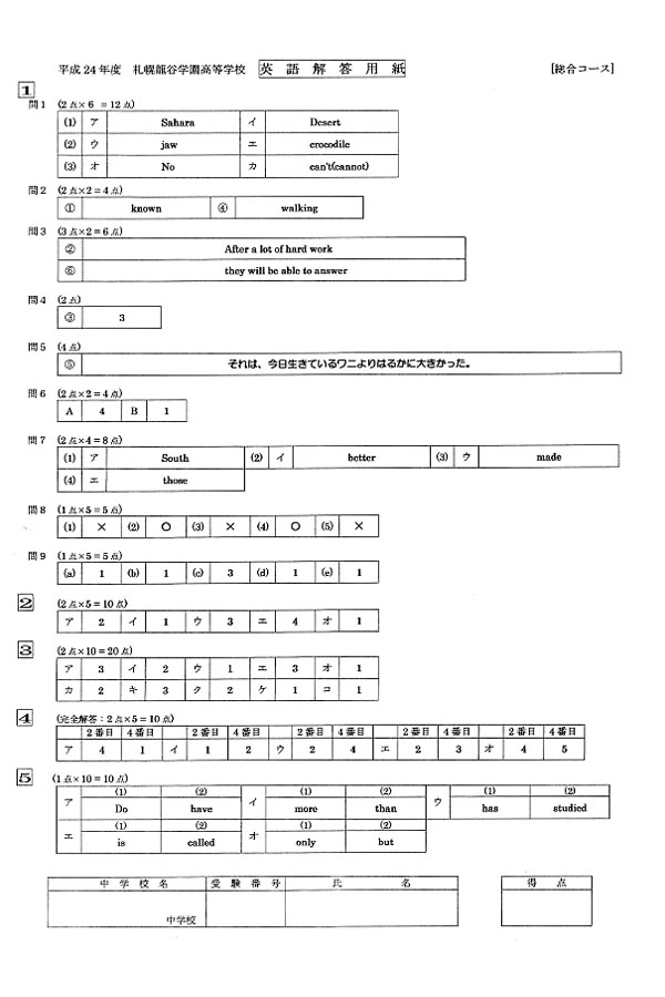 平成24年度入試過去問題 (総合コース)(英語 解答)(1ページ目)|札幌龍谷学園高等学校の入試過去問