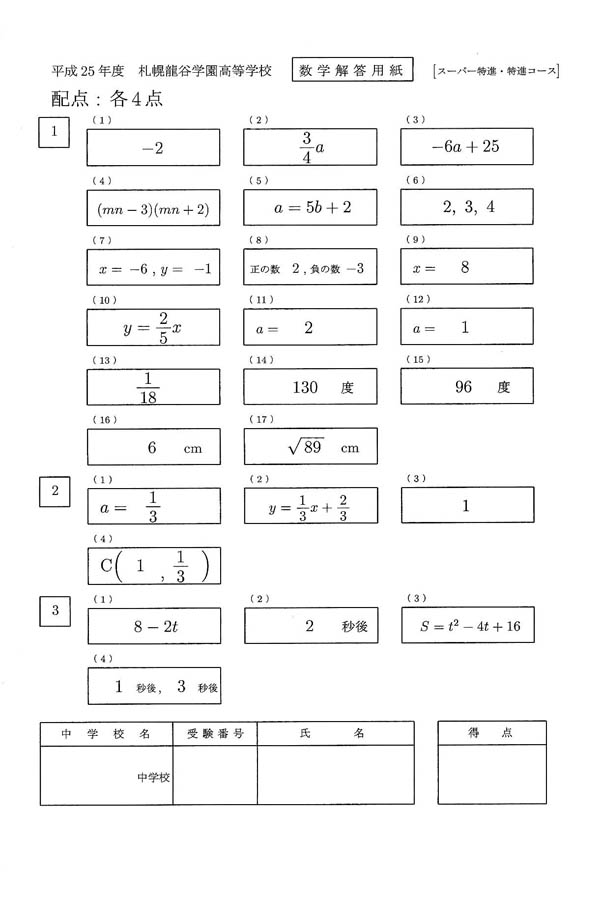 平成25年度入試過去問題 スーパー特進・特進コース(数学 解答)(1ページ目)|札幌龍谷学園高等学校の入試過去問