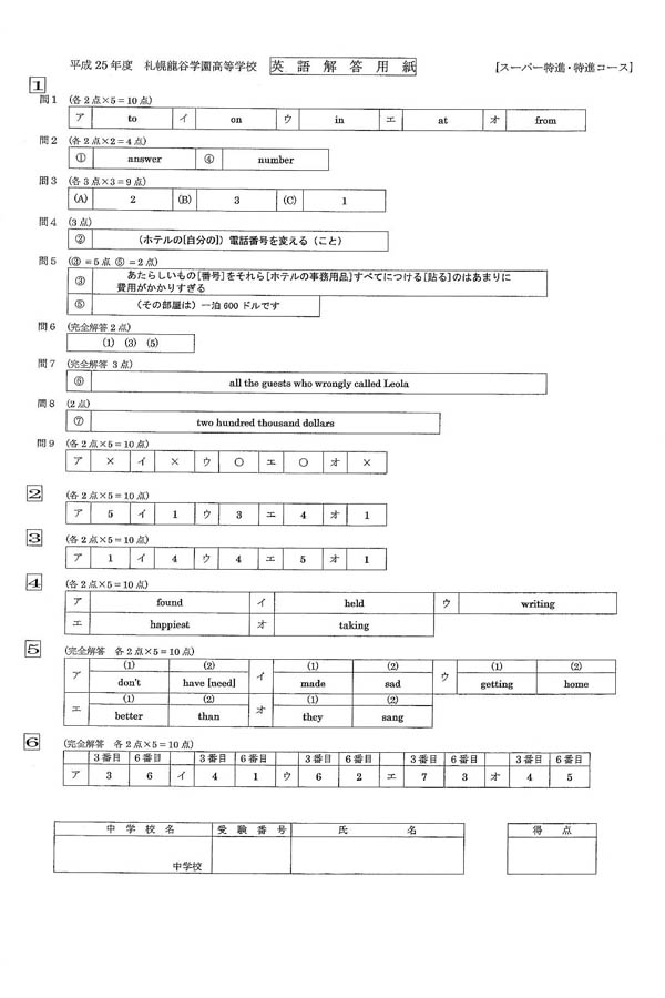 平成25年度入試過去問題 スーパー特進・特進コース(英語 解答)(1ページ目)|札幌龍谷学園高等学校の入試過去問