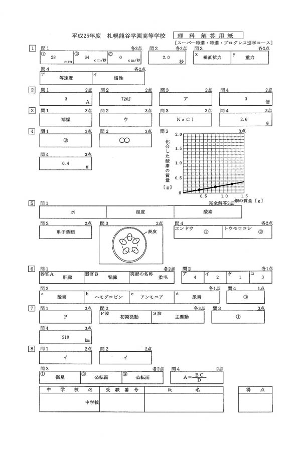 平成25年度入試過去問題 スーパー特進・特進コース(理科 解答)(1ページ目)|札幌龍谷学園高等学校の入試過去問