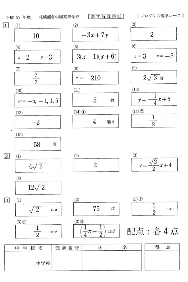 平成27年度入試過去問題 プログレス進学コース(数学 解答)(1ページ目)|札幌龍谷学園高等学校の入試過去問
