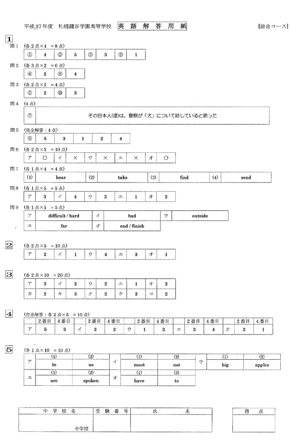 入試過去問(解答)(1ページ目)|札幌龍谷学園高等学校の入試過去問
