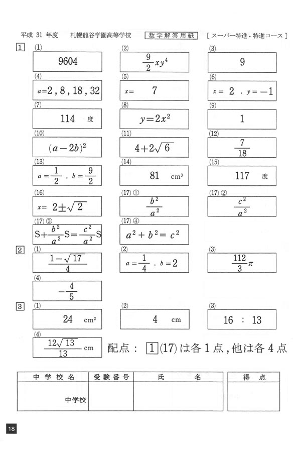 平成31年度入試過去問題 スーパー特進・特進コース(数学 解答)(1ページ目)|札幌龍谷学園高等学校の入試過去問