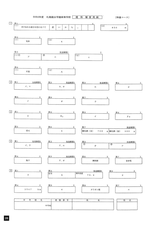 2023年度入試過去問題 特進コース(理科 解答)(1ページ目)|札幌龍谷学園高等学校の入試過去問
