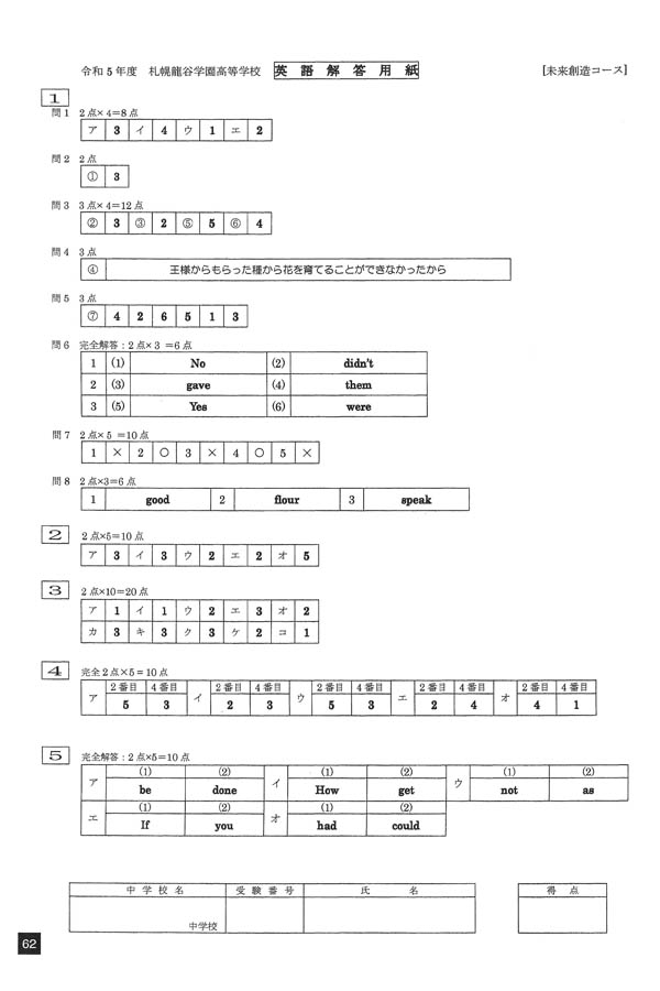 2023年度入試過去問題 未来創造コース(英語 解答)(1ページ目)|札幌龍谷学園高等学校の入試過去問
