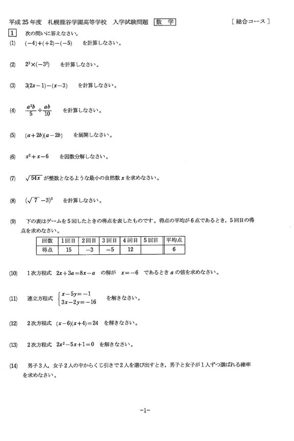 平成25年度入試過去問題 総合コース(数学 問題)(1ページ目)|札幌龍谷学園高等学校の入試過去問